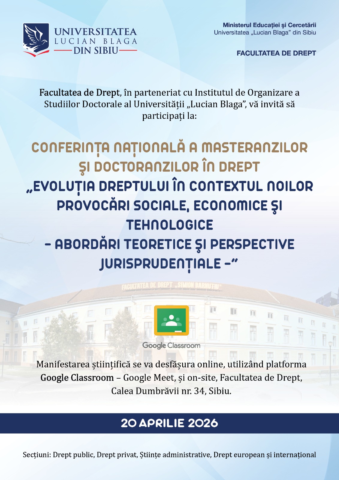 Facultatea de Drept a Universității „Lucian Blaga” din Sibiu, în parteneriat cu Institutul de Organizare a Studiilor Doctorale, organizează în data de 20 aprilie 2026 Conferința națională a masteranzilor și doctoranzilor în Drept, desfășurată în format hibrid.